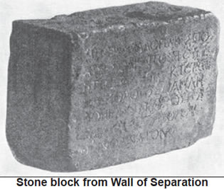 Wall of Separation Discovered in 1871, on the site of the Temple area, was a large stone block with the inscription written: "No man of another nation to enter within the fence and enclosure round the Temple and whoever is caught will have himself to blame that his death ensues." This stone inscription is now located at a museum in Constantinople, Turkey. The Apostle Paul wrote about this very wall which was up, preventing the nations, other than Judah, to approach and be within the Temple grounds. For He Himself is our peace, Who has made both one, and has broken down the middle wall of separation, having abolished in His flesh the enmity, that is, the law of commandments contained in ordinances, so as to create in Himself one new man from the two, thus making peace, Ephesians 2:14–16 NKJV. |